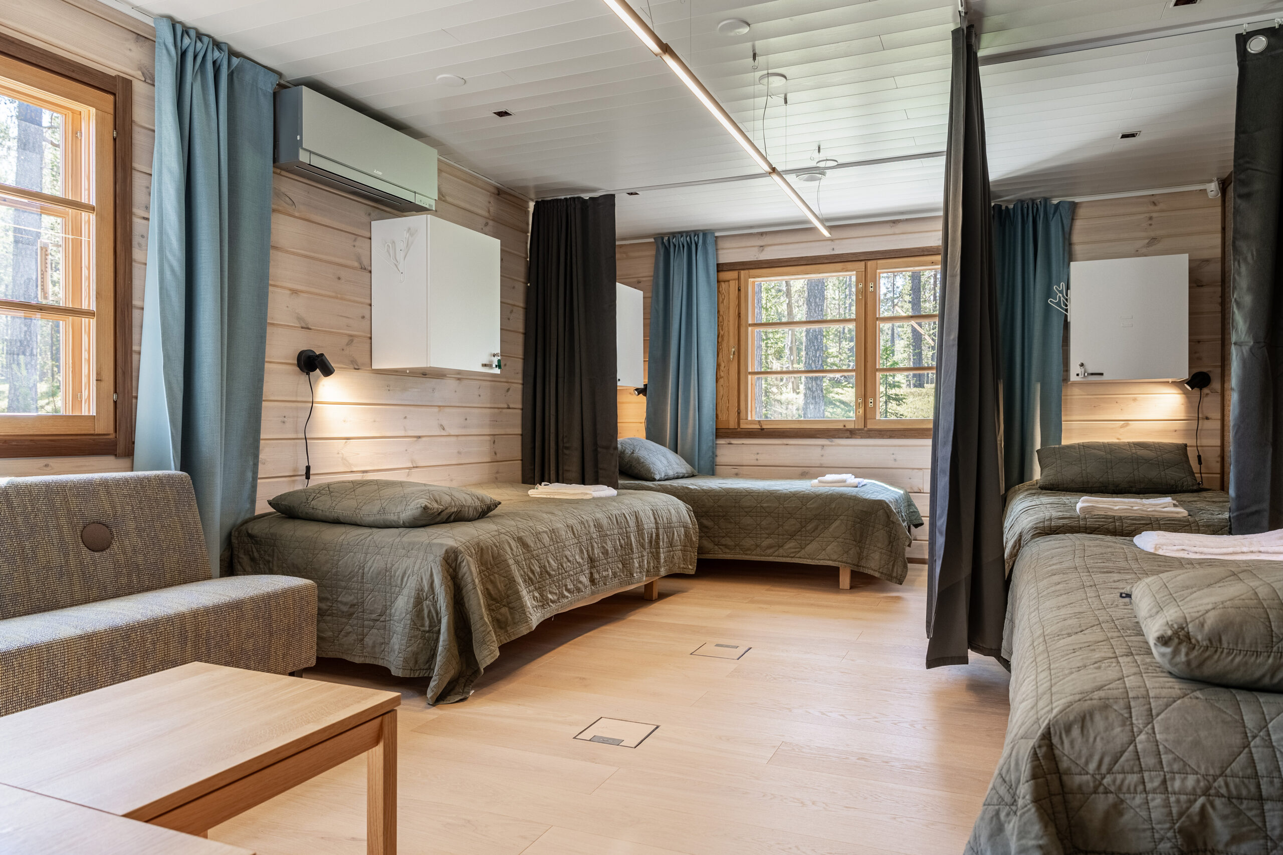 Samalla, kun vieraat voivat nauttia omasta rauhasta huoneissaan voivat he viettää aikaa porukalla suurissa ja mukavissa yhteisissä tiloissa, joista löytyy oleskelutiloja, keittiötä sekä saunatilat.